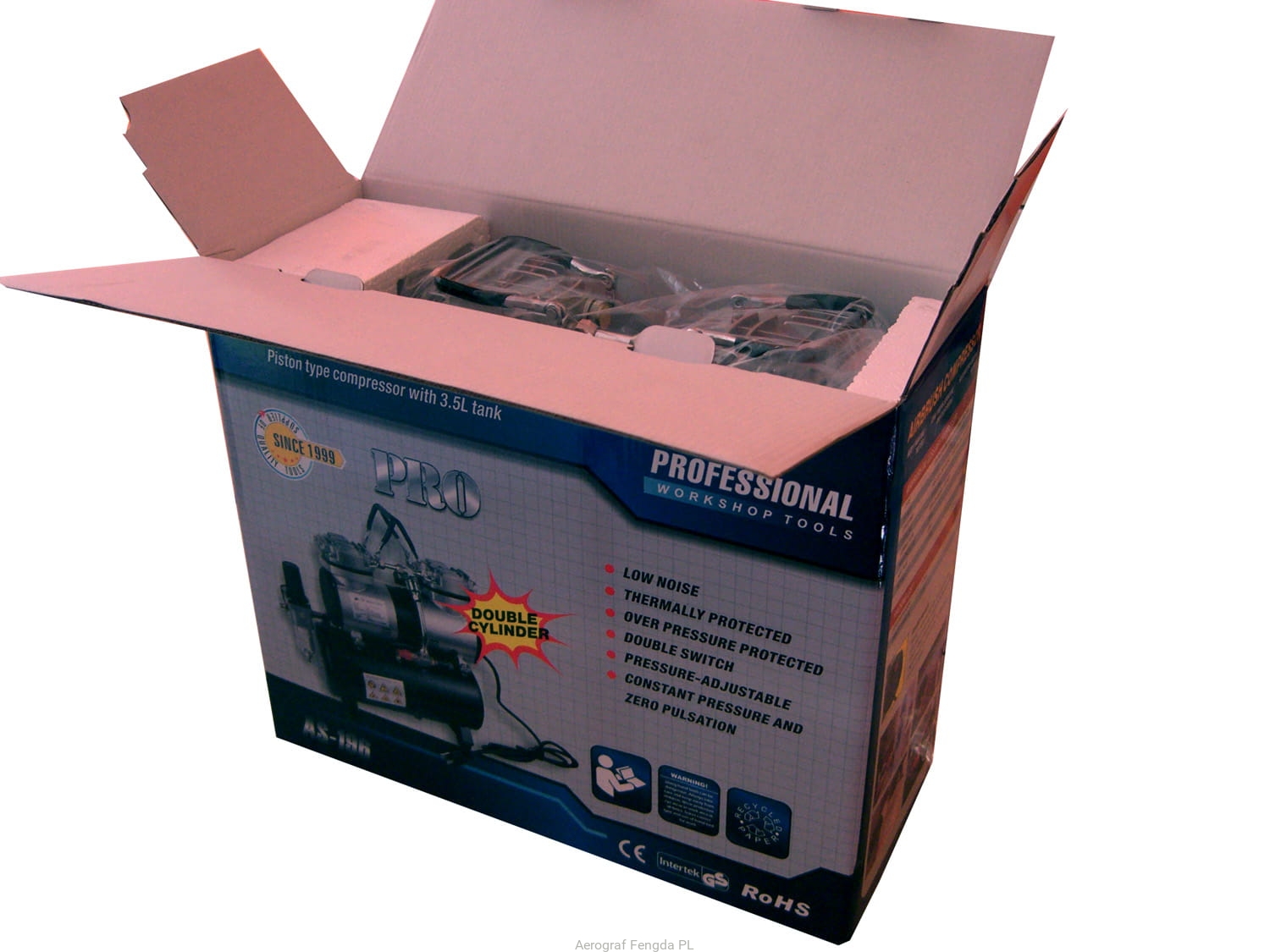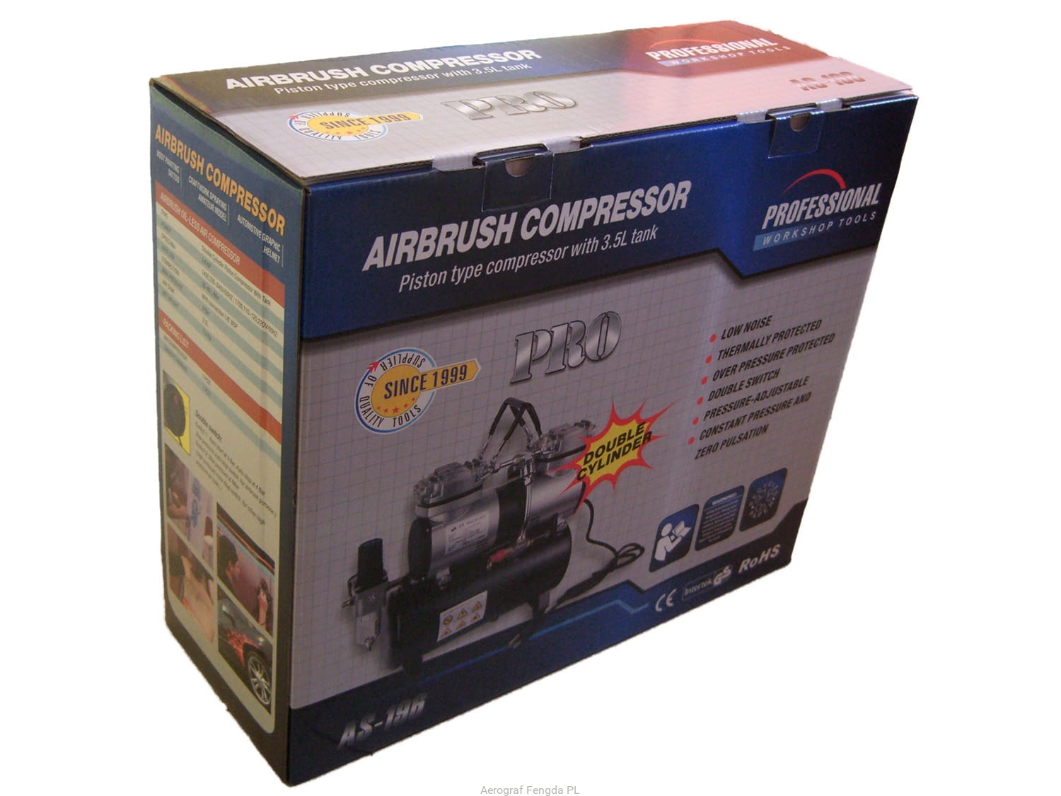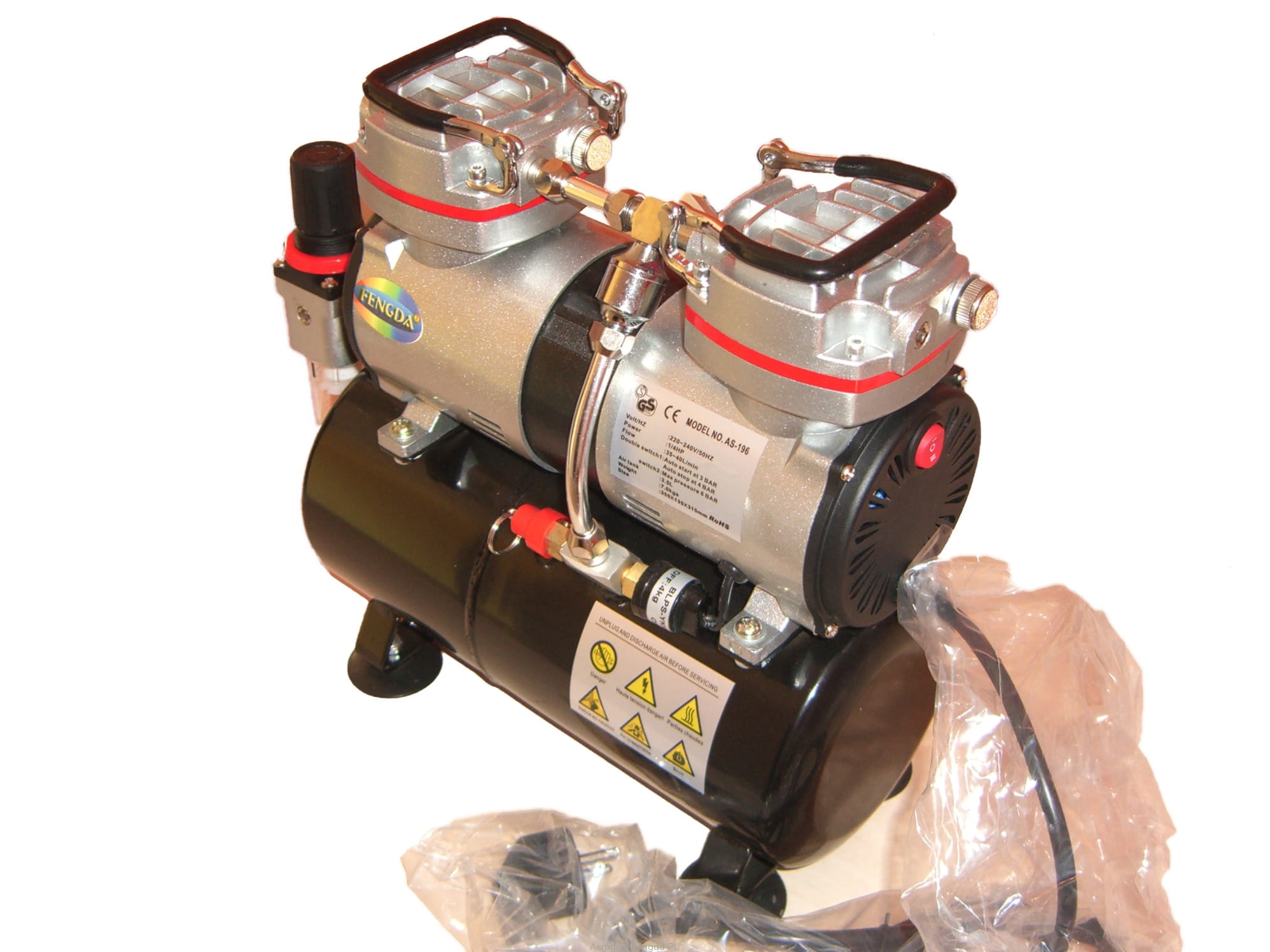 Dwutłokowy bezolejowy mini kompresor z zbiornikem (zbiornik ciśnieniowy), kompresor zawiera regulator ciśnienia na wyjściu, wyposażony w filtr, manometr.Zaletą kompresoru jest że ma dwa tłoky dzieky czemu jest szbyszy przeciw jednotłokowemu kompresoru. Dzięki swojej niewielkiej wadze są wśród przenośnych kompresorow hobby. Ten kompresore używaja do modelarstwa, ablo profesyonalne salony do paznokci. Kompresor sie da użwać i na inne zposoby.