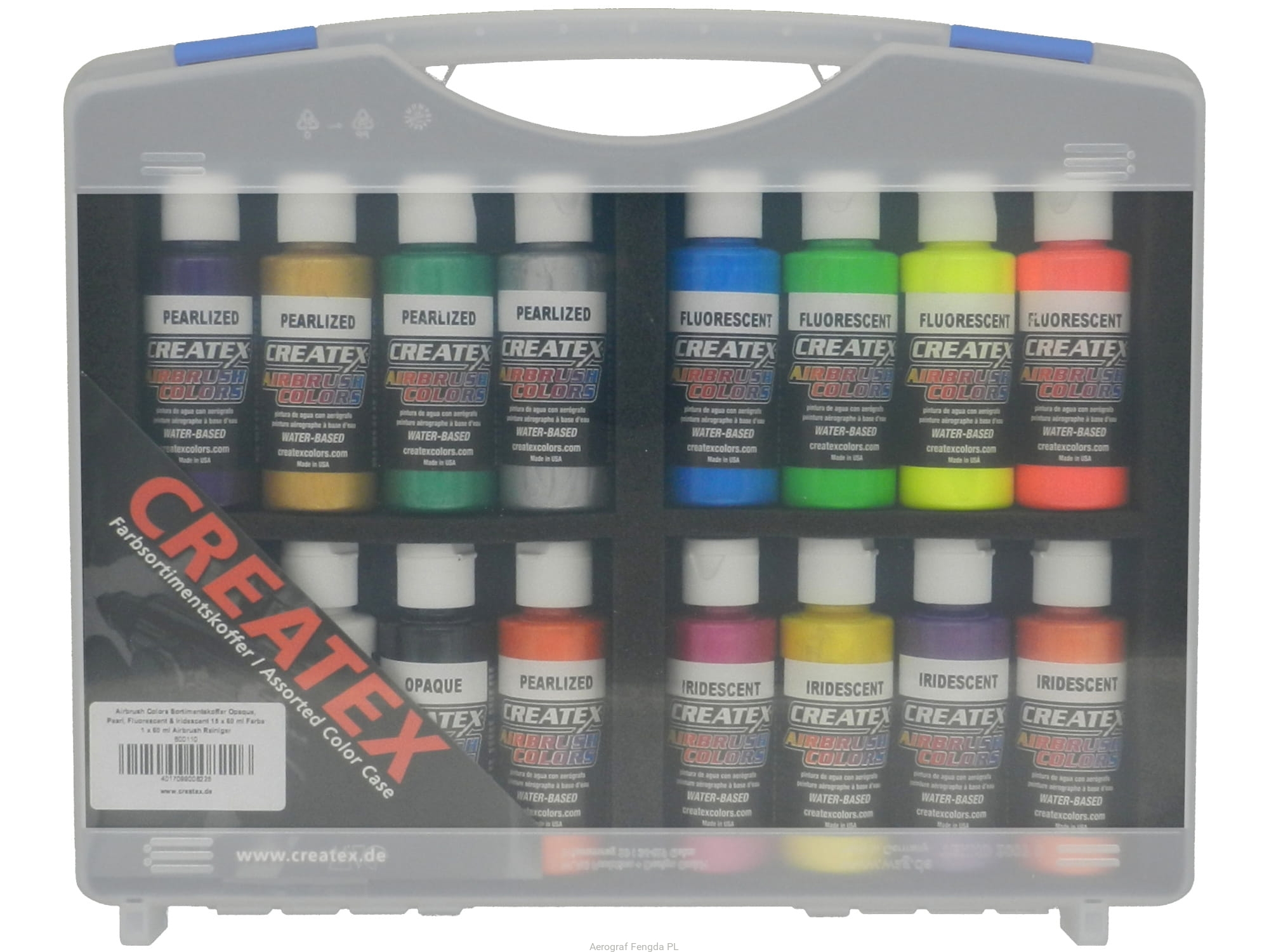 Createx Colors Case Opaque, Pearl, Fluorescent & Iridescent (15x60ml Paint, 1x60ml Airbrush Cleaner)