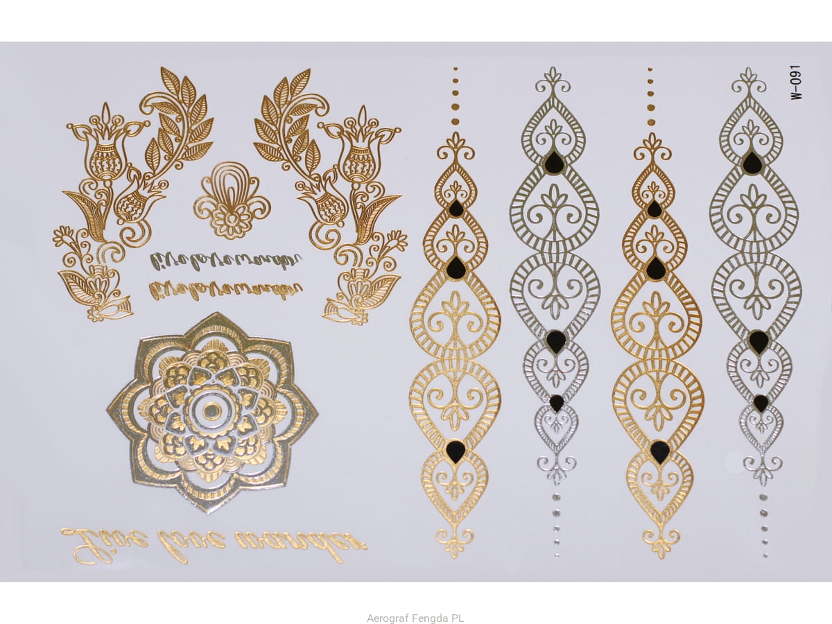 Złote a srebrne tymczasowe wodoodporne tatuażowe naklejki inspirowane biżuteria (bransoletkami, naszyjnikami, pierścionkami, indyjskie, afrykańskie, egipskie, motywy geometryczne i inne), tatuaż wytrzyma 3-5 dni, dla aplikacji i usunięcia przygotowaliśmy dla Was poradnik: