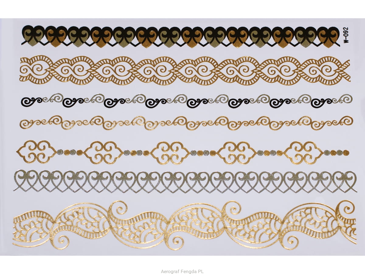 Złote a srebrne tymczasowe wodoodporne tatuażowe naklejki inspirowane biżuteria (bransoletkami, naszyjnikami, pierścionkami, indyjskie, afrykańskie, egipskie, motywy geometryczne i inne), tatuaż wytrzyma 3-5 dni, dla aplikacji i usunięcia przygotowaliśmy dla Was poradnik: