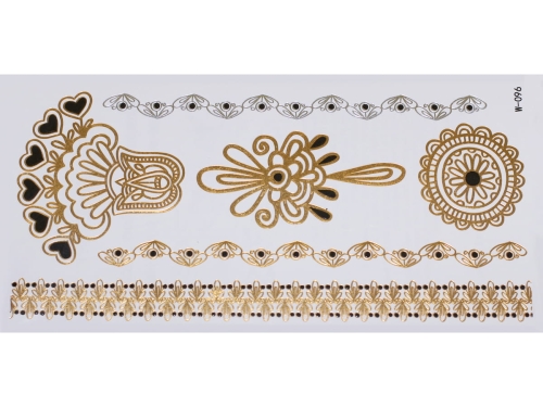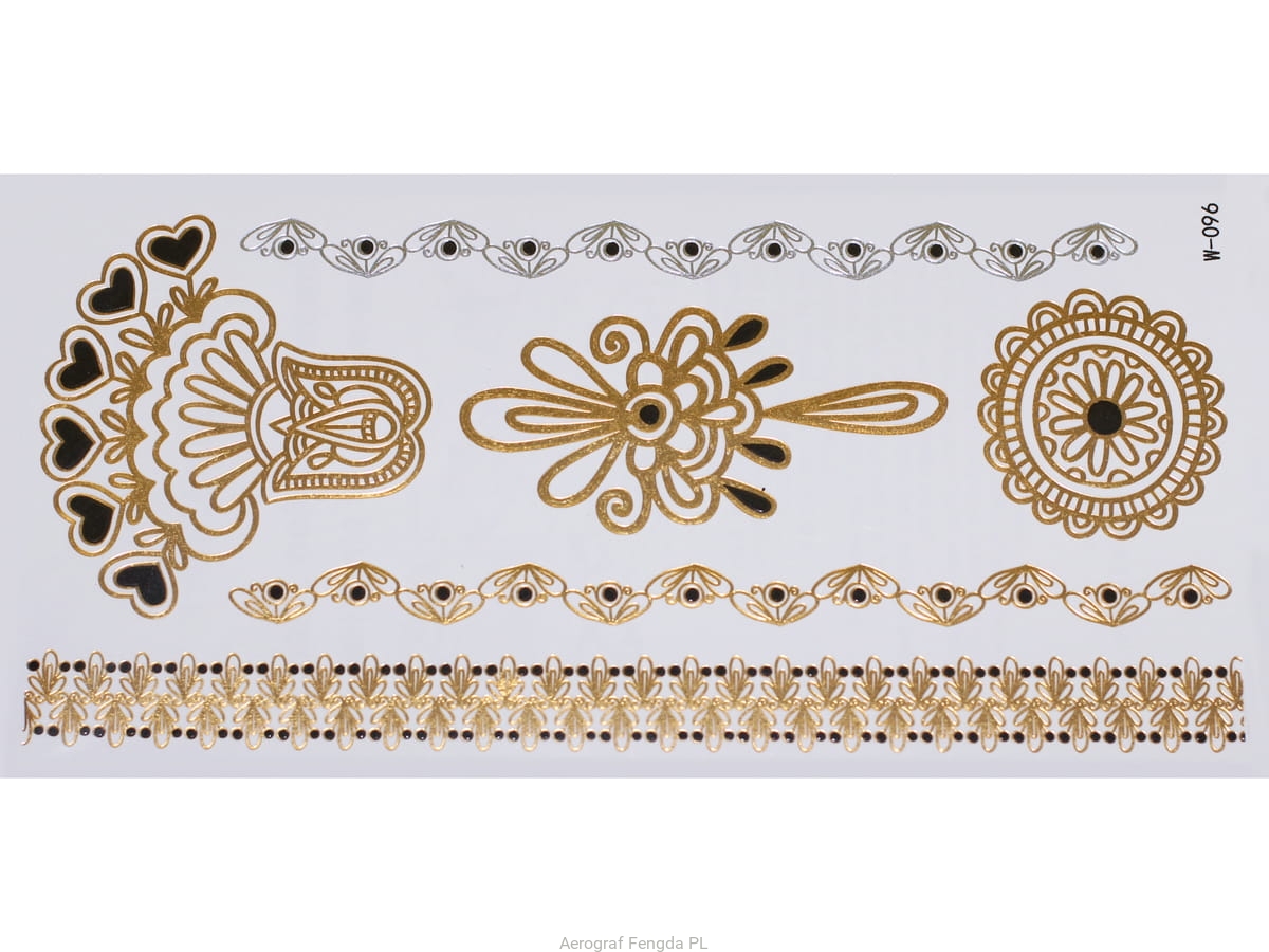 Złote a srebrne tymczasowe wodoodporne tatuażowe naklejki inspirowane biżuteria (bransoletkami, naszyjnikami, pierścionkami, indyjskie, afrykańskie, egipskie, motywy geometryczne i inne), tatuaż wytrzyma 3-5 dni, dla aplikacji i usunięcia przygotowaliśmy dla Was poradnik: