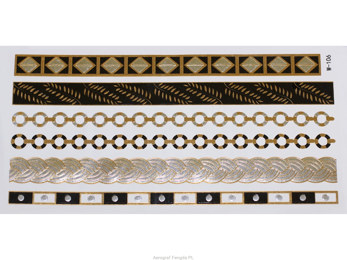 Złote a srebrne tymczasowe wodoodporne tatuażowe naklejki inspirowane biżuteria (bransoletkami, naszyjnikami, pierścionkami, indyjskie, afrykańskie, egipskie, motywy geometryczne i inne), tatuaż wytrzyma 3-5 dni, dla aplikacji i usunięcia przygotowaliśmy dla Was poradnik: