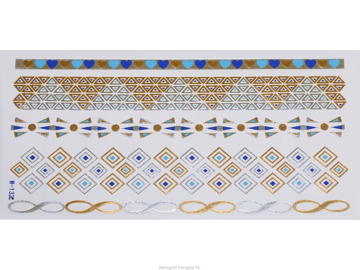Złote a srebrne tymczasowe wodoodporne tatuażowe naklejki inspirowane biżuteria (bransoletkami, naszyjnikami, pierścionkami, indyjskie, afrykańskie, egipskie, motywy geometryczne i inne), tatuaż wytrzyma 3-5 dni, dla aplikacji i usunięcia przygotowaliśmy dla Was poradnik: