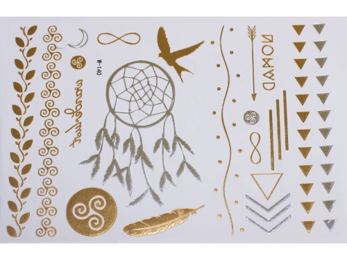 Złote a srebrne tymczasowe wodoodporne tatuażowe naklejki inspirowane biżuteria (bransoletkami, naszyjnikami, pierścionkami, indyjskie, afrykańskie, egipskie, motywy geometryczne i inne), tatuaż wytrzyma 3-5 dni, dla aplikacji i usunięcia przygotowaliśmy dla Was poradnik: